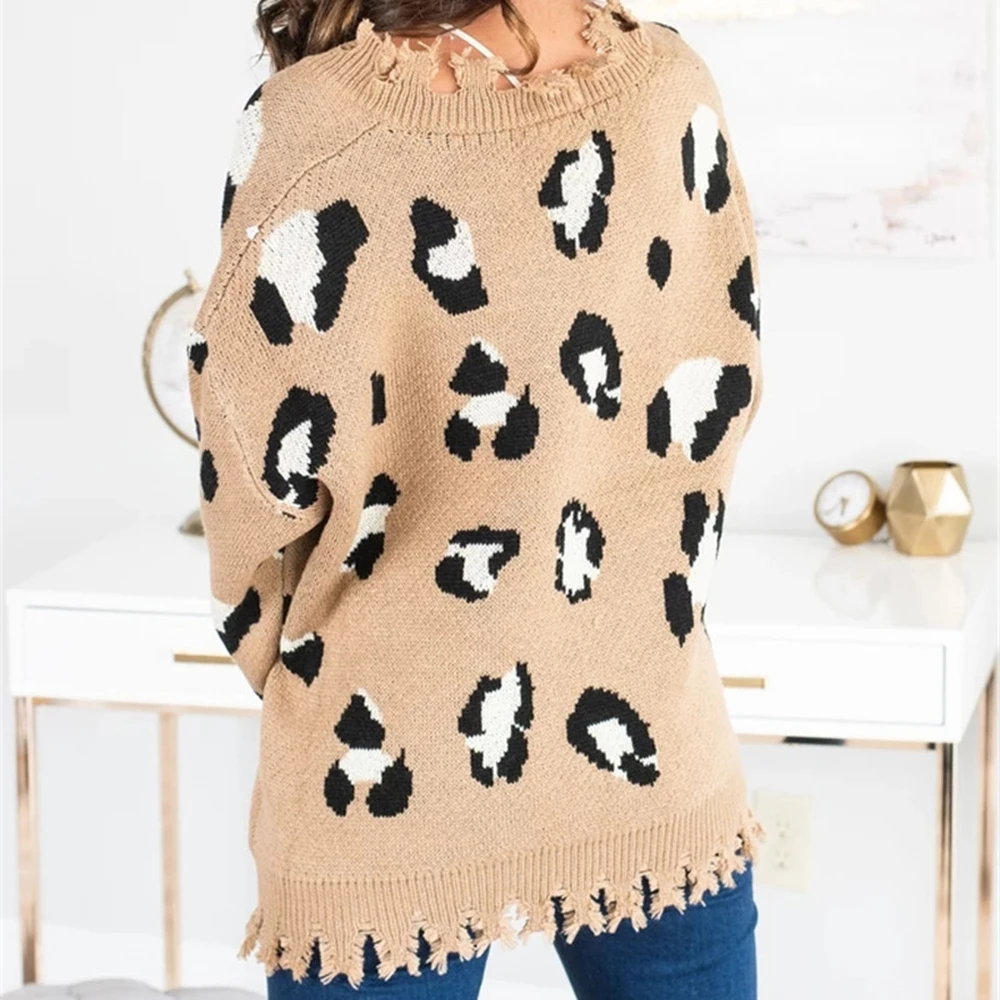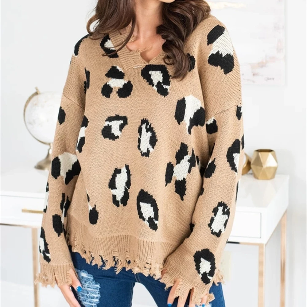 Product Name: Suéter rasgado con estampado de leopardo para mujer Sexy cuello en V de manga larga suéteres sueltos de Otoño de invierno jerséis de punto sueltos