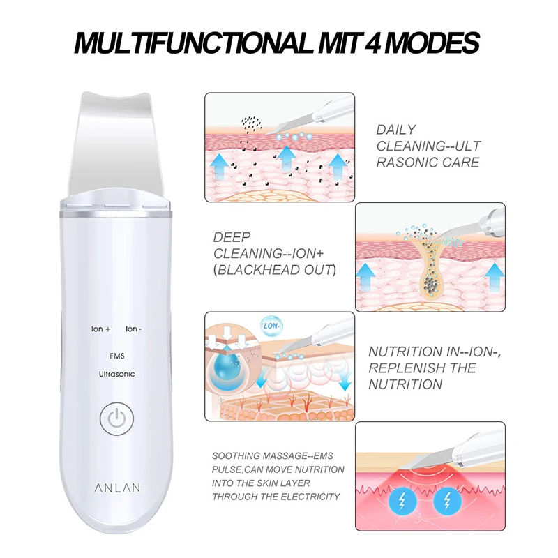 Product Name: Limpiador de piel ultrasónico ANLAN limpiador Facial espinillas eliminación de acné Spa Facial vibración masajeador ultrasónico herramientas para pelar agua