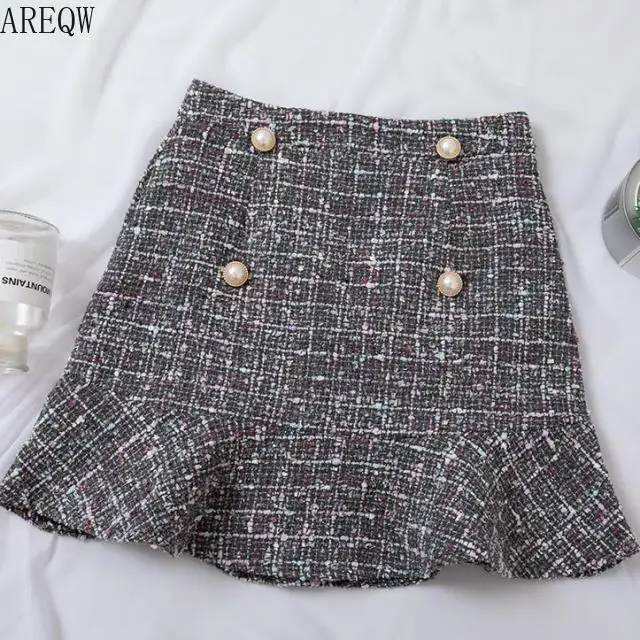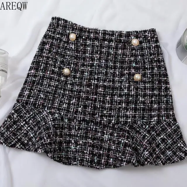 . (14% Off) Comprar Nueva falda Coreana de Tweed de cintura alta con botón de lana de media longitud falda negra Otoño Invierno 2019 Online Baratos.