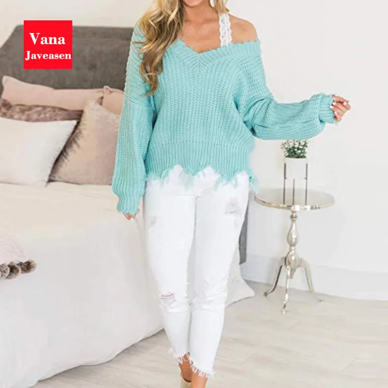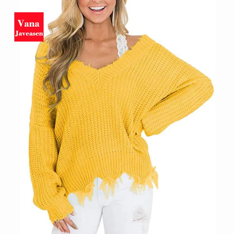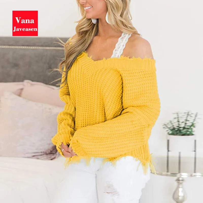 Special Offer Vana Javeasen fuera del hombro suéter de otoño para las mujeres flecos desgastados de punto de las tapas de manga larga Jersey suéteres Discount 30% Today!